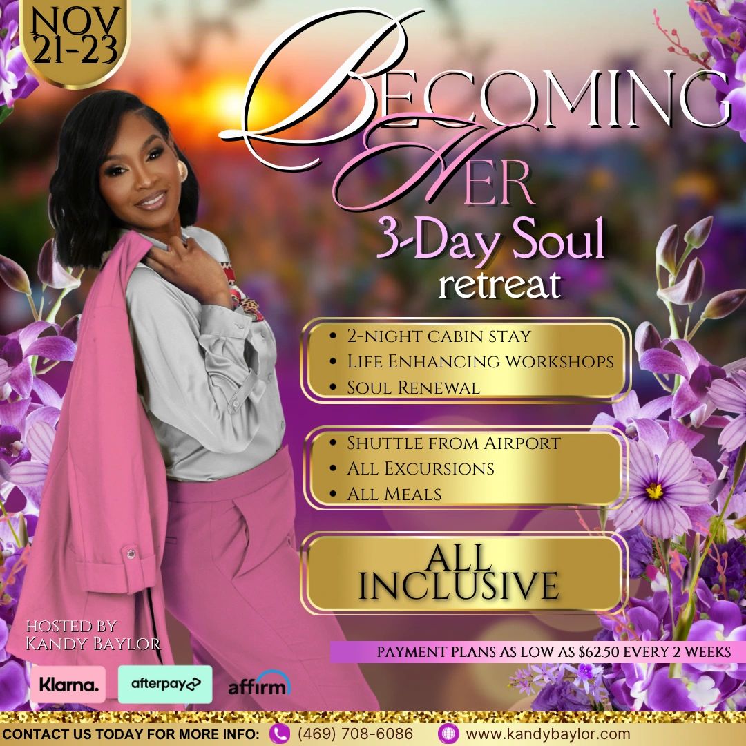 Becoming Her is a 3-day immersive retreat designed for women who are ready to heal deeply, rise boldly, and walk confidently into who God created them to be.